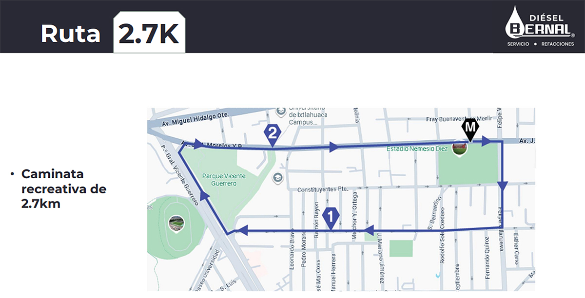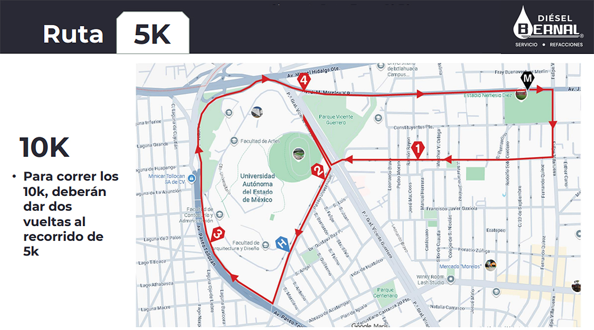 - Salida y Meta: Frente al Estadio Nemesio Diez sobre Av. Felipe Villanueva, Toluca, EdoMéx.