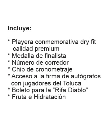 - Tendremos firma de autógrafos con algunos Diablos Rojos del Toluca. Para poder asistir deberás estar inscrito a la carrera.